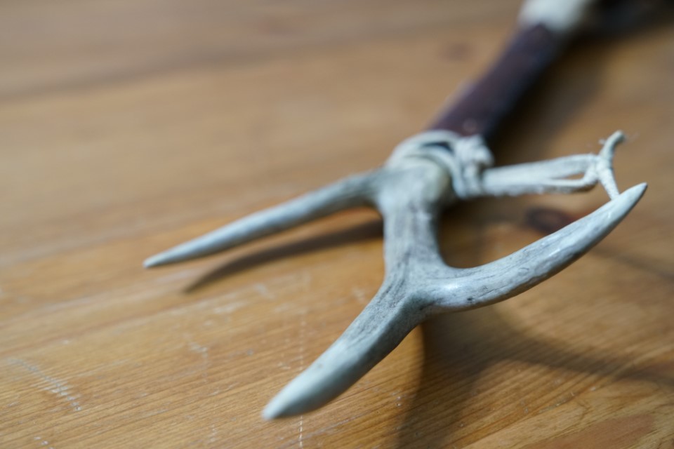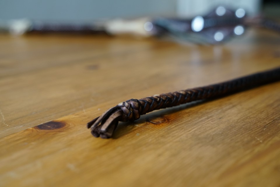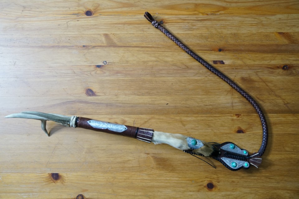 Kamcha, a traditional hand-crafted leather whip from Kazakhstan. The handle is made of the antler and front limb of a saigak (steppe wild antelope) and lavishly decorated with traditional ornaments. Body: 56cm / 21.6″, handle: 66cm / 26″ long.